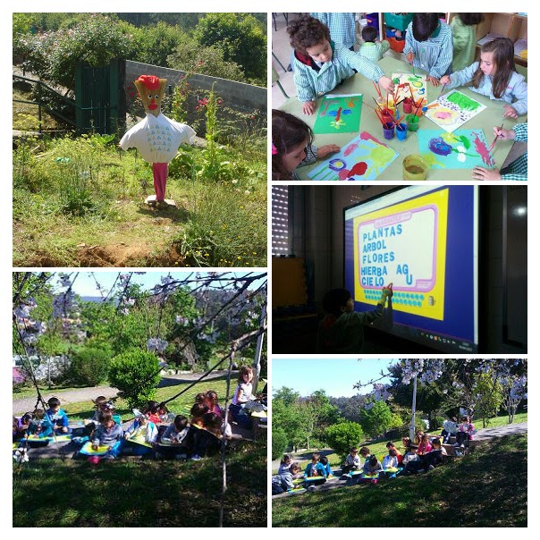 Aproveitando a maravillosa contorna do cole, o alumnado de catro anos saliu a facer debuxos de observación da paisaxe, das árbores, da horta, do espantallo...Fixádevos que atentos están.