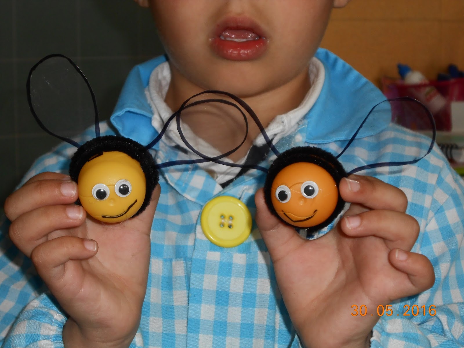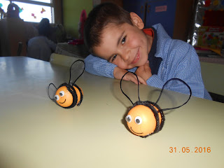 Fai un tempo a mestra pediu a vosa colaboración para achegar á escola, ovos plásticos para facer unha manualidade. Sabedes o que fixemos cos ovos? Unhas simpáticas avispas. Tede moito coidado que non son inofensivas, pois ata lle fixemos o aguillón.