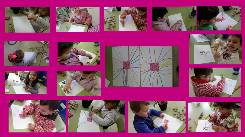 Rematamos esta actividade moi alegres co resultado e decoramos a aula. Cada cartolina foi unha cousa diferente: araña, sol, cempés, xoaniña, unha cabeza con moitos brazos... cada artista puxo un nome diferente a súa obra.